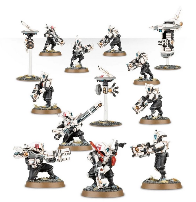 Ten wieloczęściowy plastikowy zestaw zawiera 137 elementów, z których można wykonać 10 Pathfinderów T'au, drona z akceleratorem impulsów, drona hamującego grawitację i drona zwiadowczego.